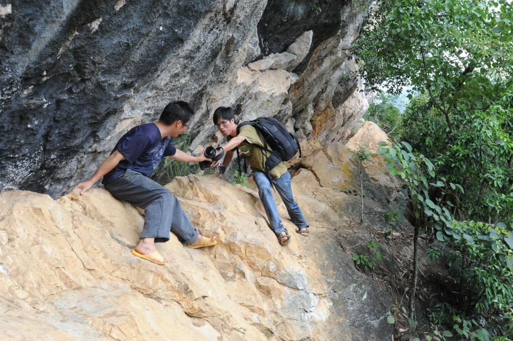 2012年9月3日,在广西大化瑶族自治县板升乡弄雷村,新华社记者黄孝邦(右)攀爬悬崖去采访。