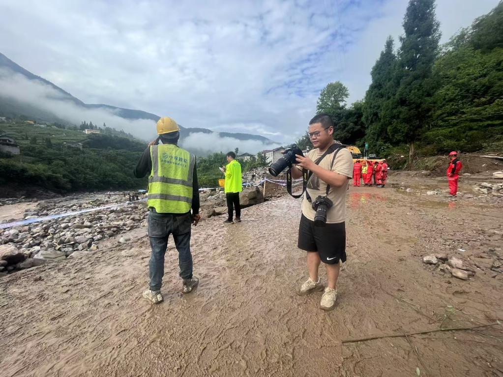 2024年7月21日,新华社记者王曦在在四川省雅安市汉源县马烈乡新华村采访拍摄暴雨泥石流灾害救援情况。