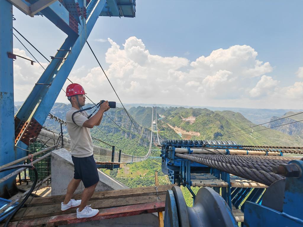 2024年9月4日,贵州分社记者欧东衢在花江峡谷大桥建设现场采访。