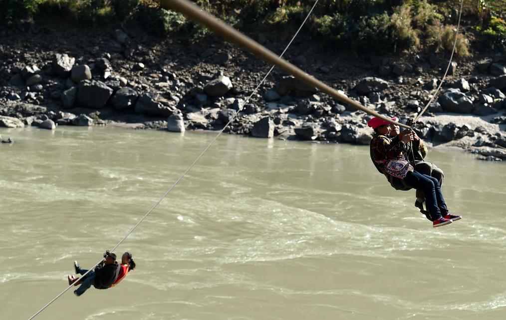 2016年11月26日,游客(左下红衣者)和当地群众在怒江傈僳族自治州泸水县六库镇辣子咪村溜索过江。如今,溜索在怒江已基本“告退”,这些最后的溜索,成为见证大峡谷交通变迁的“活化石”。新华社记者 蔺以光 摄