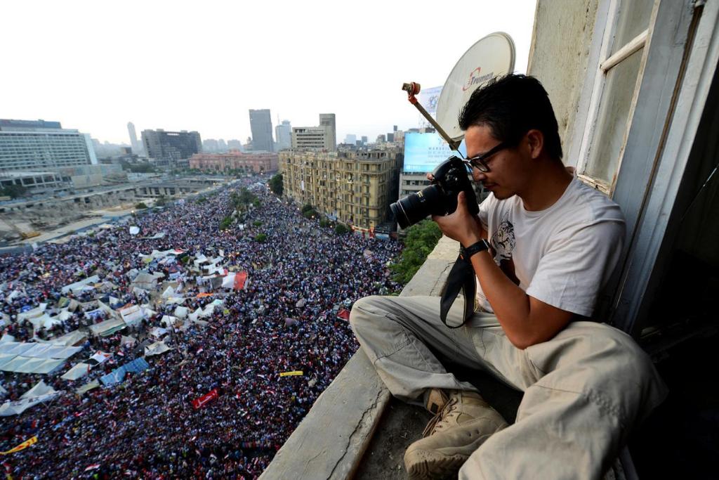 李木子:“2013年7月3日,我坐在开罗解放广场附近一间租来的房间窗台上,拍摄着广场上沸腾的集会人群。窗外的喧嚣与历史涌动触手可及,为了捕捉一个更具冲击力的角度,我将自己置于一个险峻的位置。自那一刻起,时间飞逝,十一年间,世事变幻,我完成了两个驻外任期,但对抵达新闻现场的渴望始终未曾改变。”