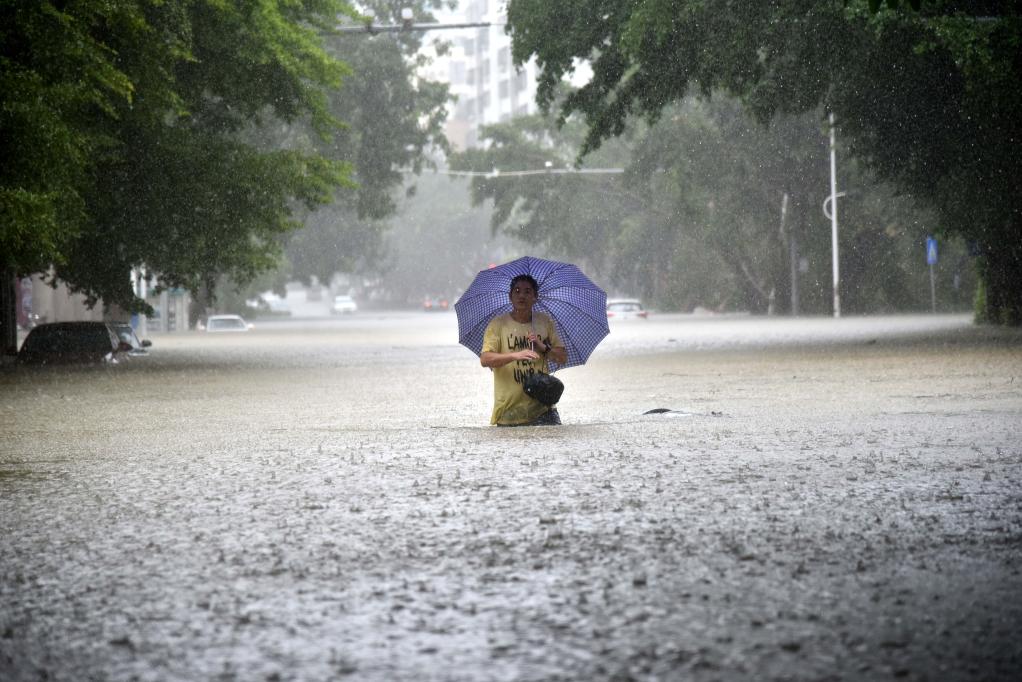 2018年9月17日,阳春市一位市民在积水严重的街道上行走。当日,2018年第22号台风“山竹”过境后的广东阳江阳春市遭遇暴雨袭击,城市部分区域出现内涝。新华社记者周科摄