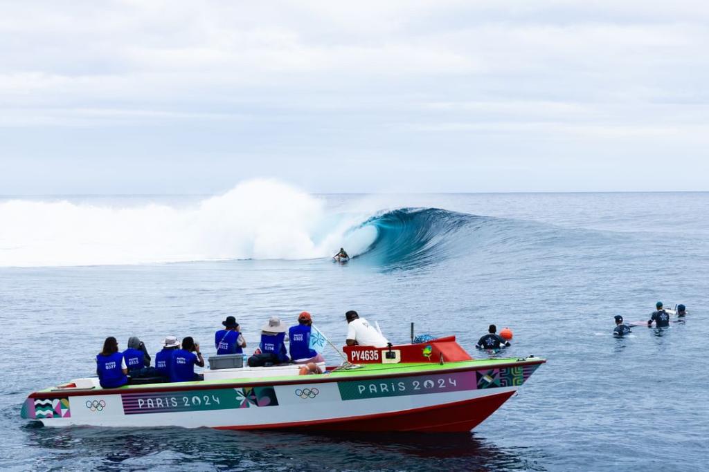 2024年7月28日,新华社摄影记者马平(船上右三)在法属波利尼西亚塔希提拍摄冲浪比赛。