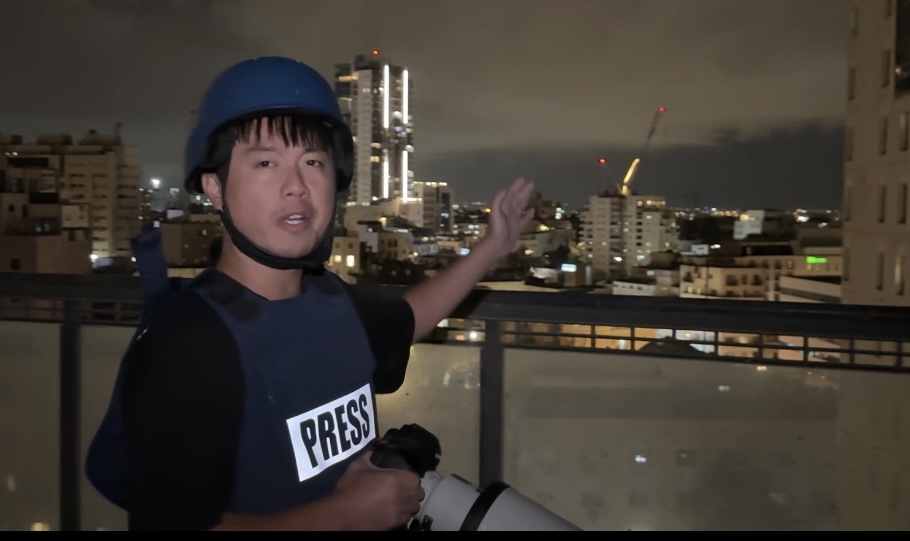 2024年10月1日,陈君清在耶路撒冷一处高楼上报道伊朗弹道导弹袭击以色列。