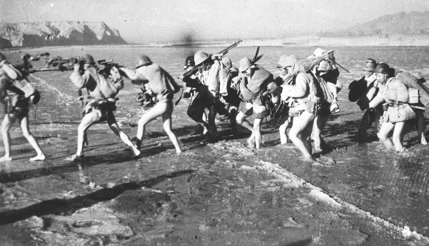 袁苓对这张照片的记忆只剩下寒冷:“战士们光着腿渡河,3月里,河面全是冰茬。我和战士们一起过河,拍摄了这个画面。”