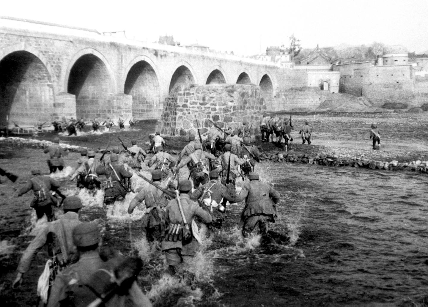 1947年4月16日正(定)太(原)战役中,我军某部突击队强渡微水河,向井陉县城东关敌阵地进军。