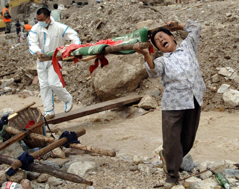 2010年8月12日,一名舟曲妇女抬出亲人的遗体后悲痛万分。当日,许多遇难或失踪者的家属在舟曲县城泥石流灾害现场,祭奠亲人,寄托对亲人的无限哀思。新华社记者 刘潇 摄