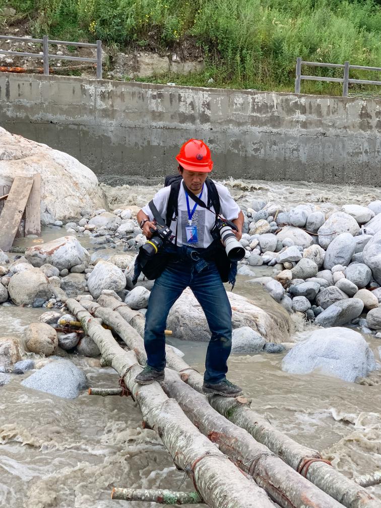 “在听闻还有最后一个村民小组的被困群众即将转移到临时安置点时,我便早早的来到了他们的必经之路上——一座临时搭建的钢桥。暴雨泥石流冲毁原有的进村组道路后,这座钢桥便成了唯一的生命通道。”