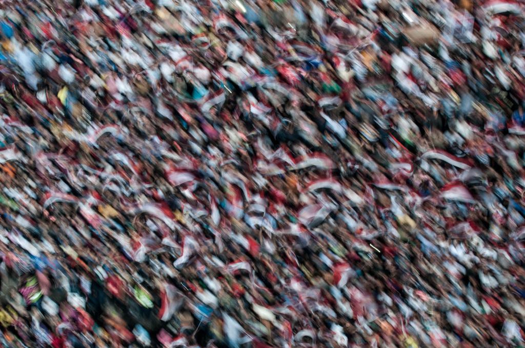 2013年7月3日,在埃及开罗解放广场,民众在集会上挥舞旗帜。埃及总统穆尔西当地时间2013年7月3日下午通过社交网站发表声明,呼吁通过建立联合政府达成全国和解,强调将按照自己的路线图回应民众诉求。 新华社记者李木子摄