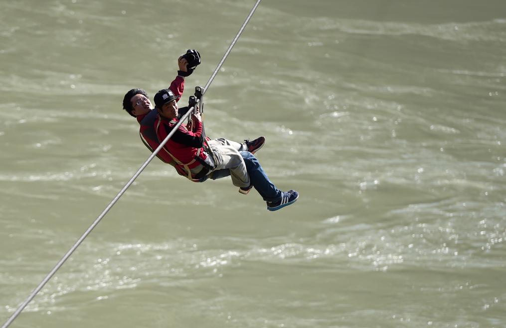 2016年11月26日,新华社记者蔺以光(左)溜索过怒江采访。