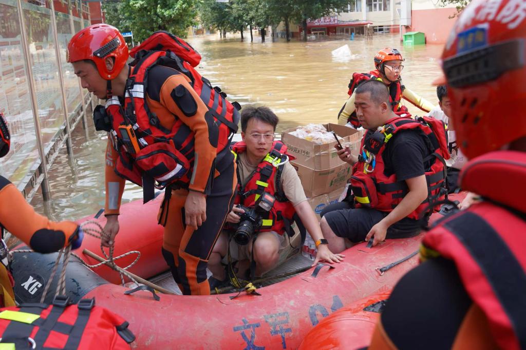 2024年7月29日,记者张楠(左二)跟随消防救援人员乘坐橡皮艇,为吉林省临江市解放社区受灾群众运送物资。