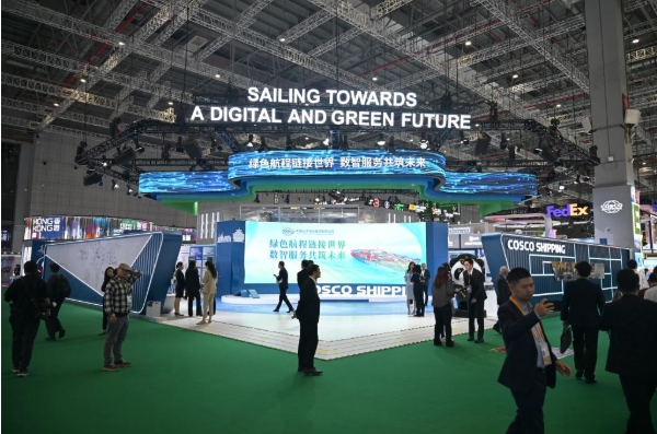 11月5日在第七届进博会服务贸易展区拍摄的中国远洋海运集团有限公司展台。 新华社发(陈浩明摄)