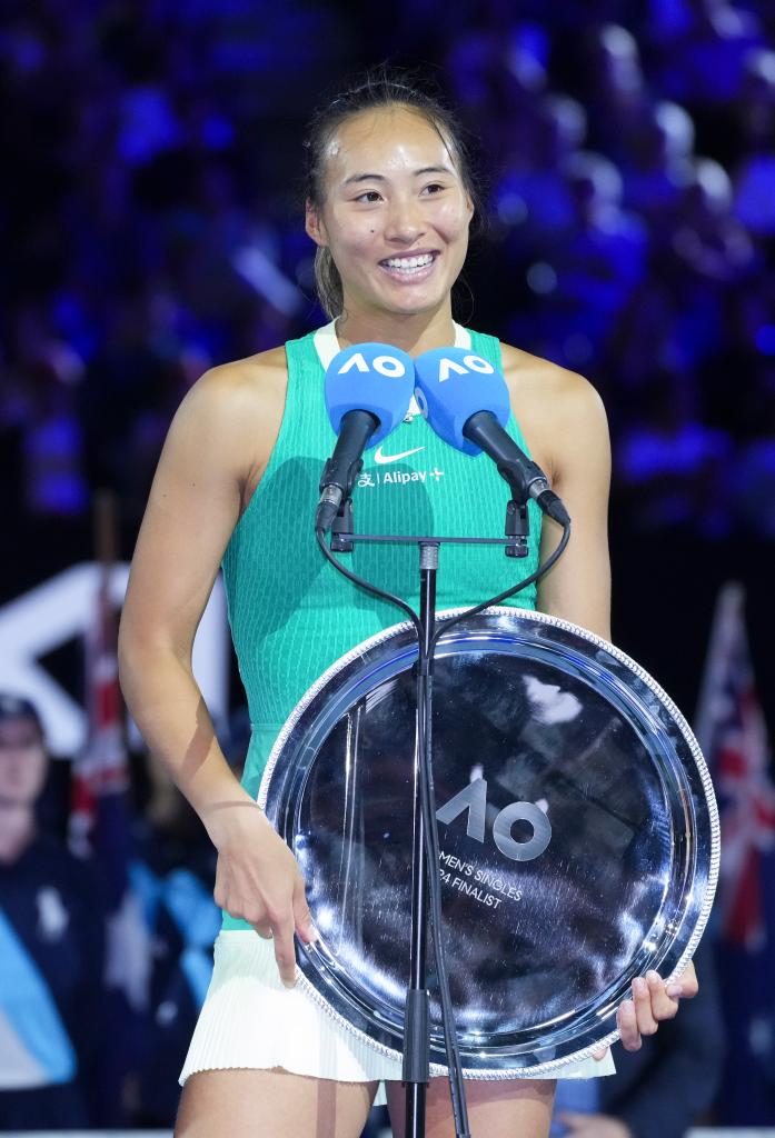 1月27日,郑钦文在澳网女单颁奖仪式上发言。新华社记者 王申 摄