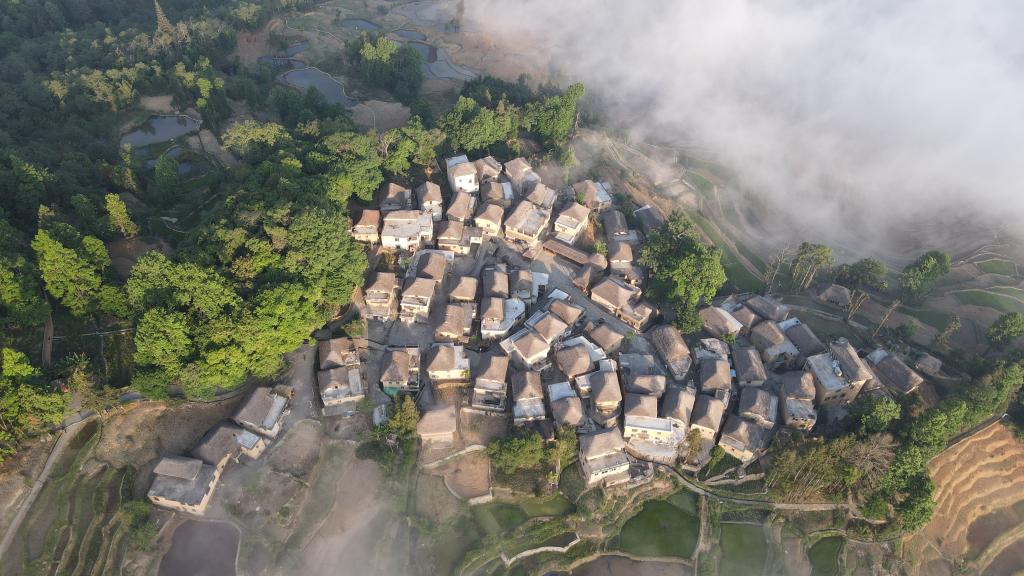 云南省红河哈尼族彝族自治州元阳县阿者科村风光(2024年4月24日摄,无人机照片)。新华社发(张艳 摄)