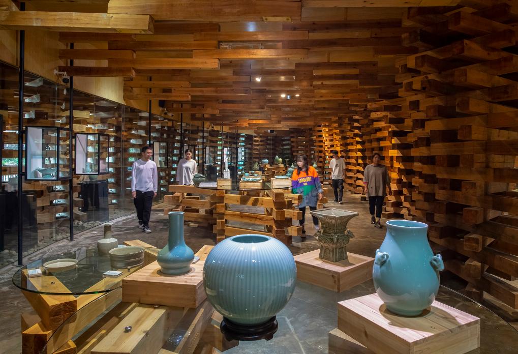 浙江省丽水市龙泉市溪头村“国际竹建筑双年展”上展示的龙泉青瓷(2023年5月13日摄)。新华社发(张有钢摄)