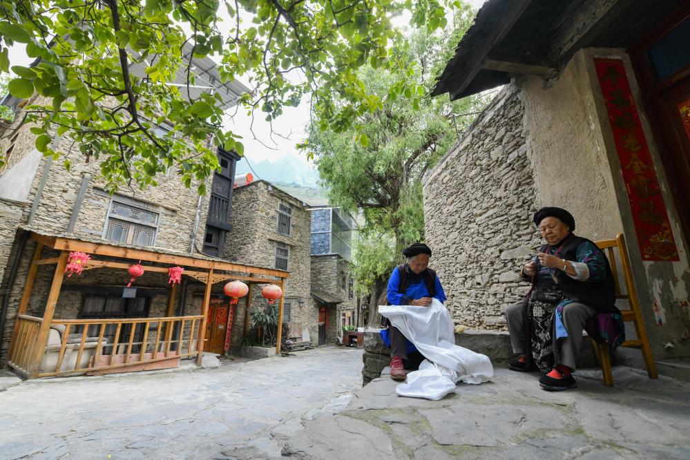 在四川省阿坝藏族羌族自治州理县桃坪村,羌族村民在自家房屋前做针线活(2023年9月13日摄)。新华社记者 王曦 摄