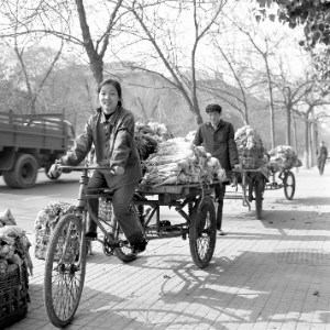 1960年11月拍摄的北京街头运送大白菜的三轮车队。