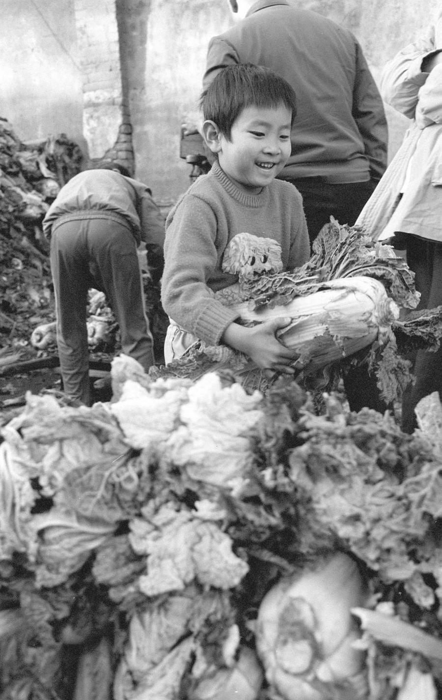 1988年11月,一名儿童在北京一个冬储菜售卖点帮助大人搬白菜。
