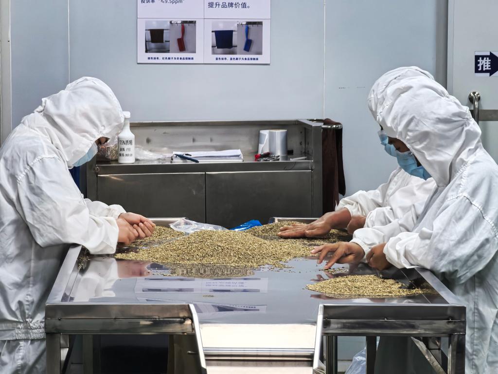 在宝硕公司生产车间内,工人在分拣小茴香。新华社记者王楚然 摄
