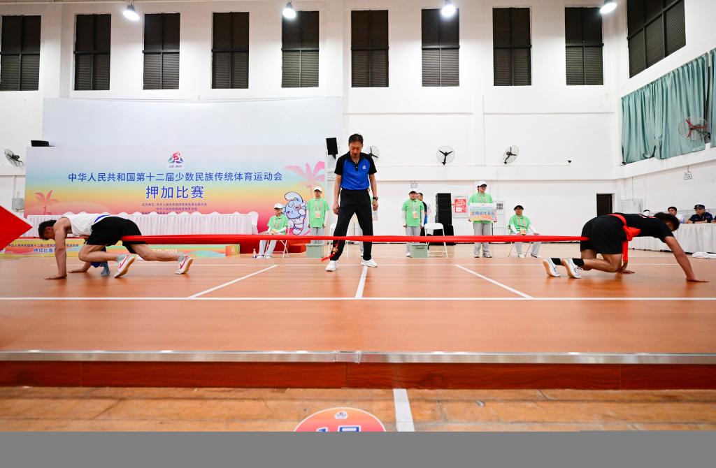 11月24日,新疆队选手额热斯别克·居马德里(左)和云南队选手陈赵龙在比赛中。当日,第十二届全国少数民族传统体育运动会押加项目55公斤级第一阶段第三轮比赛举行。新华社记者 周牧 摄
