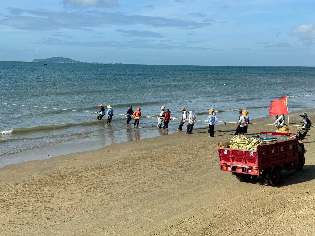 清晨的三亚湾,渔民们正赤脚在沙滩上与大海进行“拔河”——这是当地渔民收网捕鱼的独特景象,他们要在两小时内收起上千米长的渔网。渔民们期待赢下这场与大海的较量,从而得到丰厚的渔获。