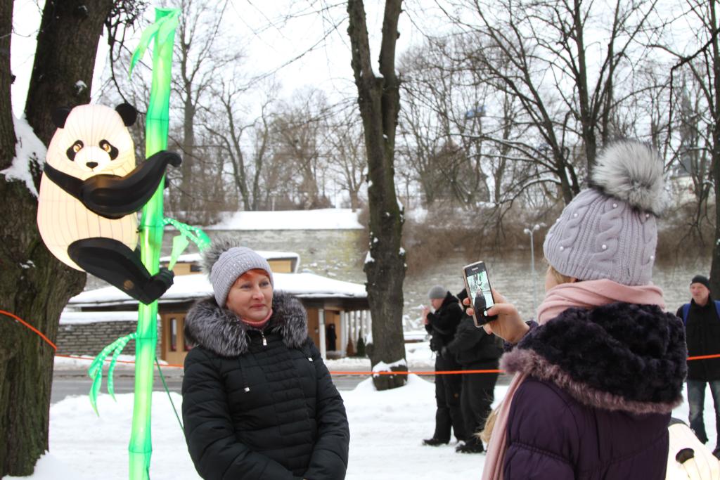 2019年2月2日,在爱沙尼亚首都塔林,一名女子与中国熊猫彩灯合影留念。塔林当天举行“欢乐春节”精彩演出和文化庙会活动,数千名当地民众扶老携幼踏雪而来,共庆中国农历新年。新华社记者郭春菊摄