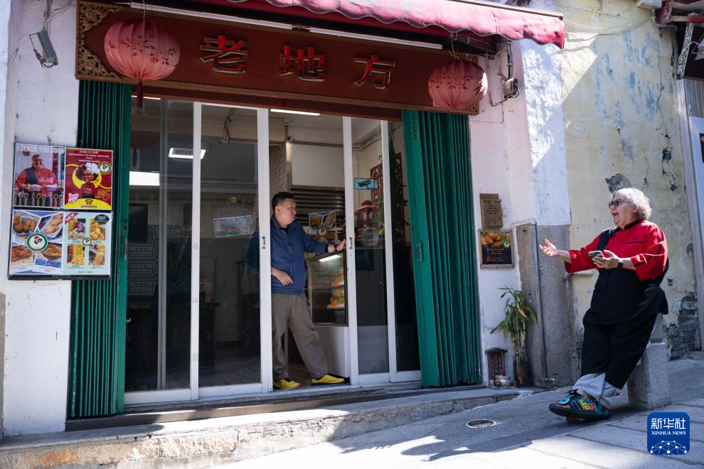 土生葡人马安娜(右)在“老地方”餐厅门口与同事聊天(12月3日摄)。新华社发(张金加摄)