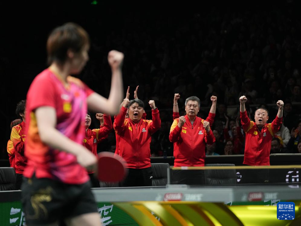12月8日,中国队选手王曼昱在女单比赛中得分后,中国队教练员为她庆祝。最终,她3比0战胜韩国队选手金娜英。新华社记者 胥冰洁 摄
