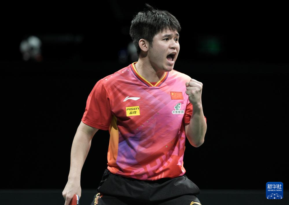 12月8日,中国队选手林诗栋在男单比赛中得分后庆祝。最终,他3比0战胜韩国队选手吴晙诚。新华社记者 胥冰洁 摄