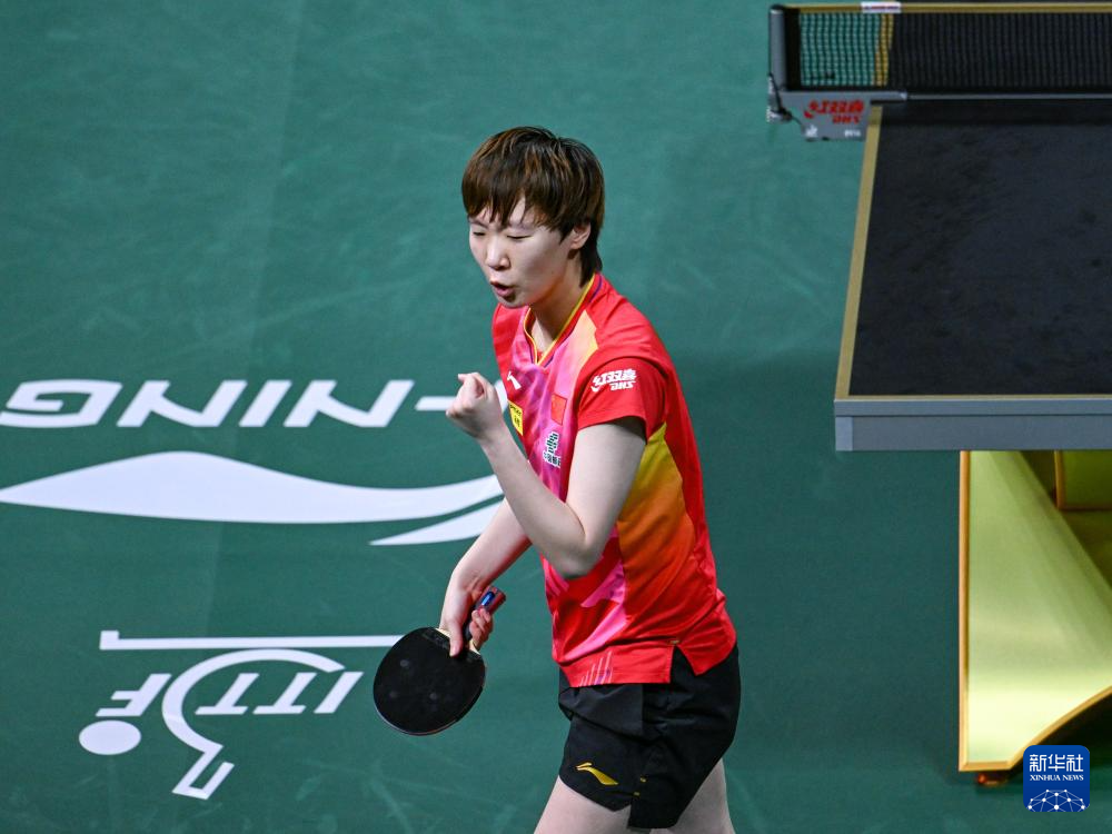12月8日,中国队选手王曼昱在女单比赛中庆祝得分。最终,她3比0战胜韩国队选手金娜英。新华社记者 王曦 摄