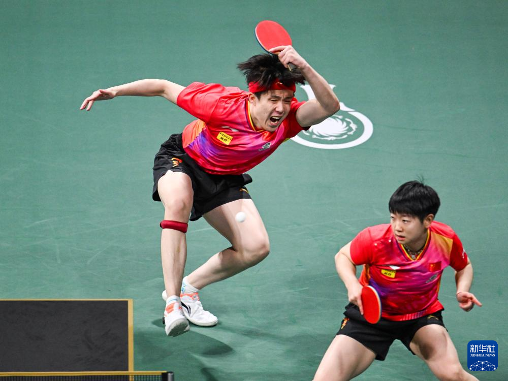 12月8日,中国队组合王楚钦(左)/孙颖莎在混双比赛中。最终,他们2比1战胜韩国队组合赵大成/申裕斌。新华社记者 王曦 摄