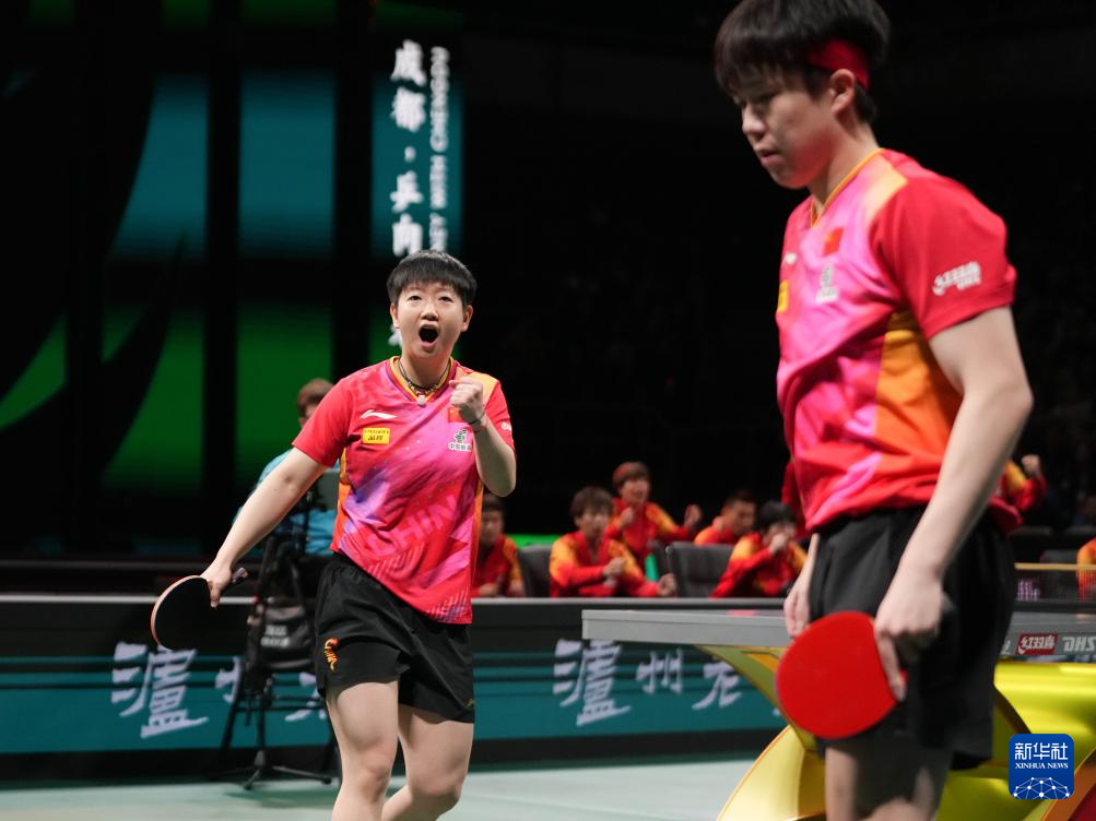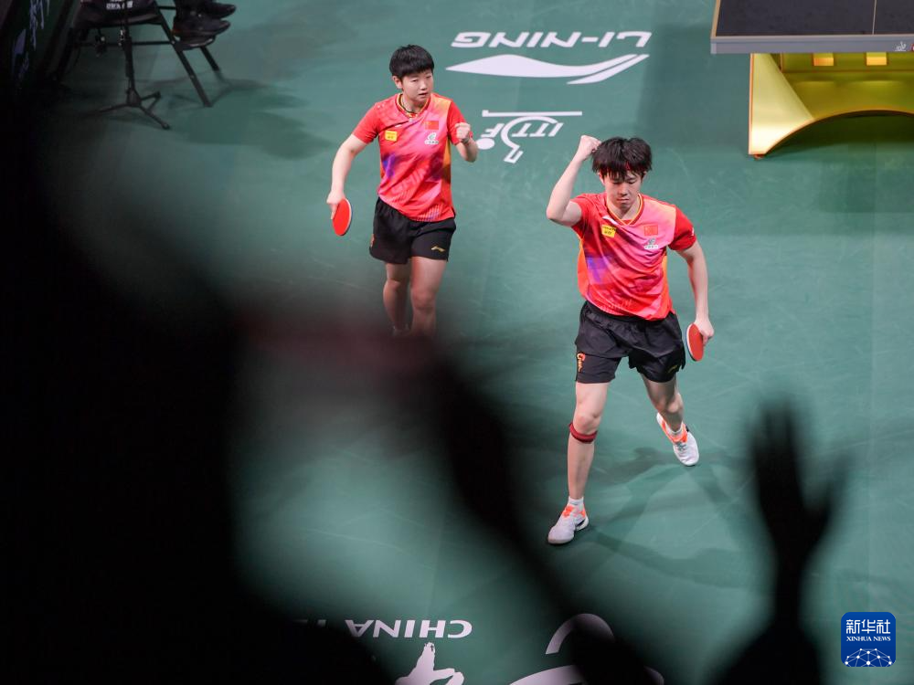 12月8日,中国队组合王楚钦/孙颖莎(左)在混双比赛中庆祝。最终,他们2比1战胜韩国队组合申裕斌/赵大成。新华社记者 胥冰洁 摄