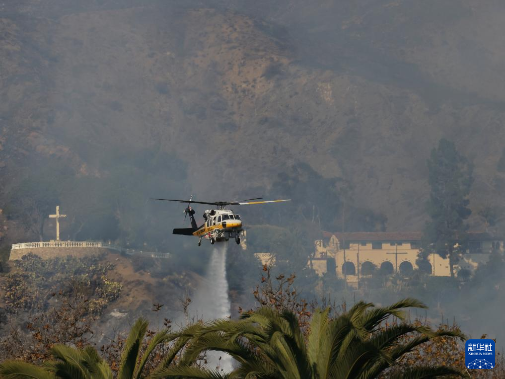 12月10日,在美国加利福尼亚州洛杉矶县马利布,一架消防直升机正在扑灭野火。新华社发(邱晨 摄)