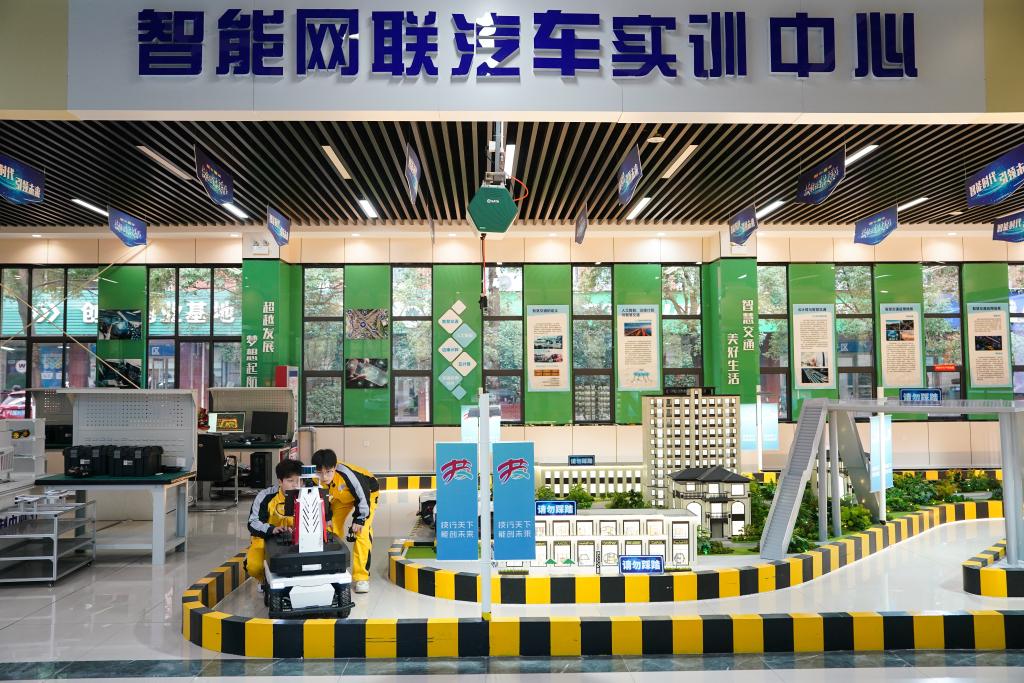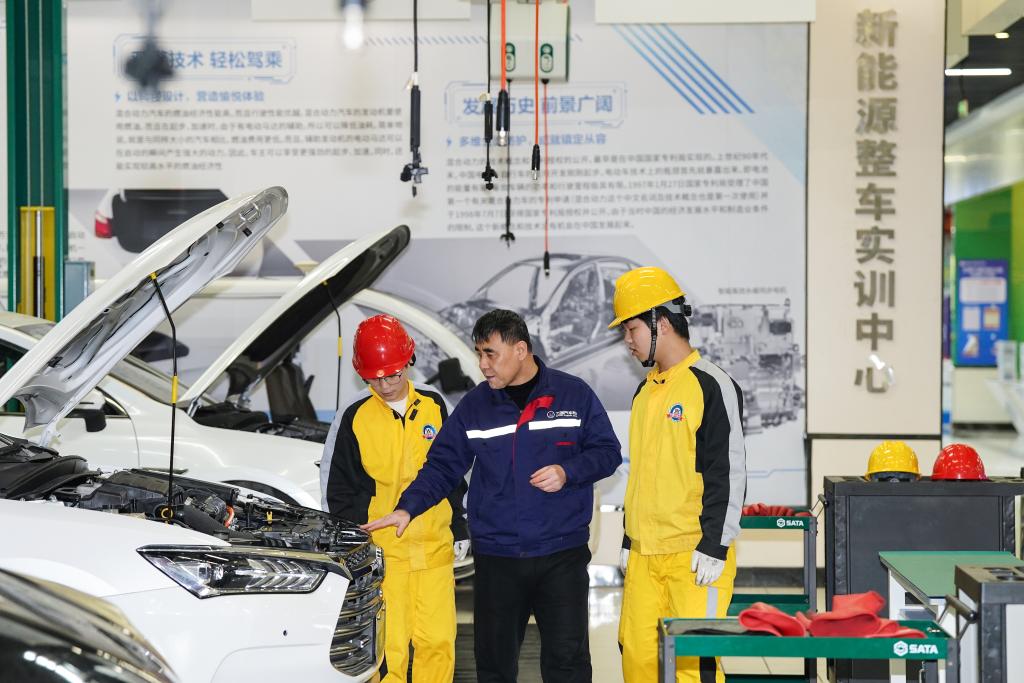 安徽万通技师学院智能网联汽车工程专业学生在学校新能源汽车实训中心内学习。