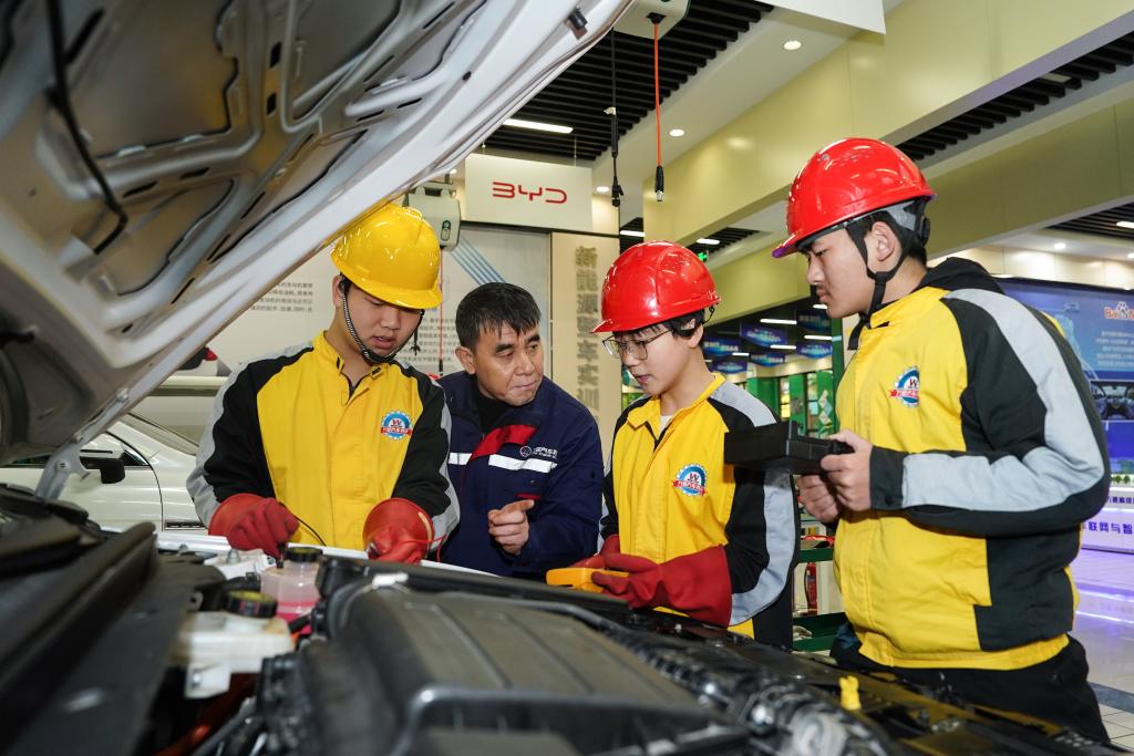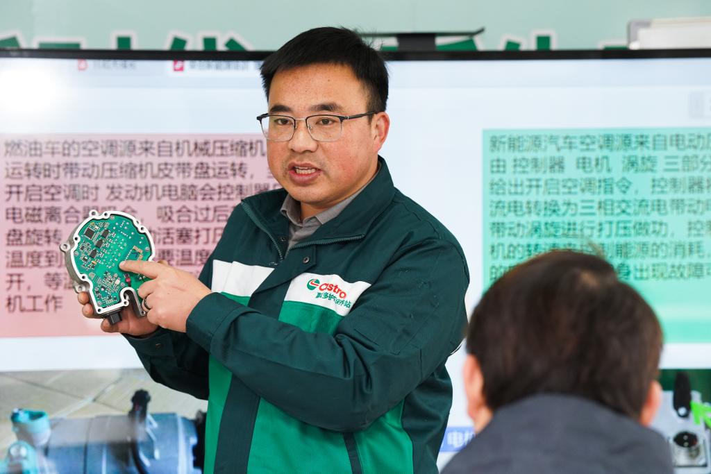 赵飞在进行新能源汽车维修培训。