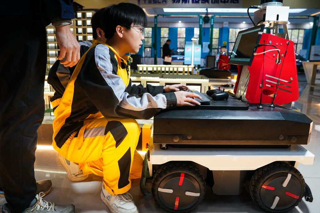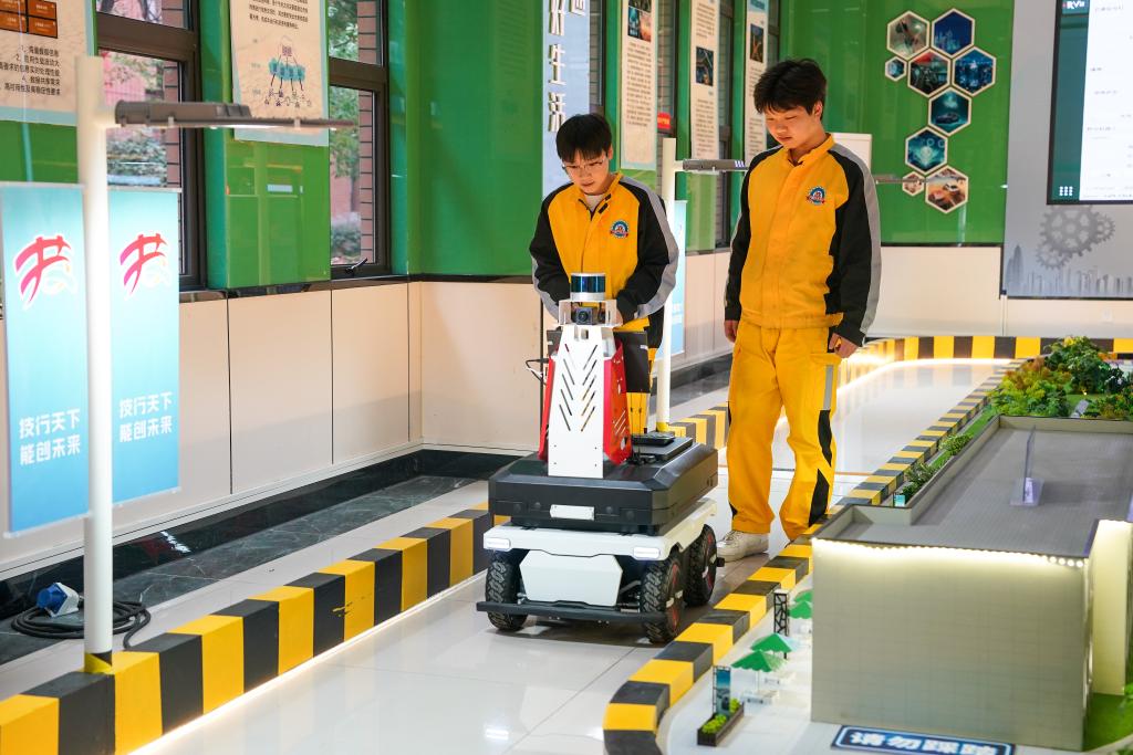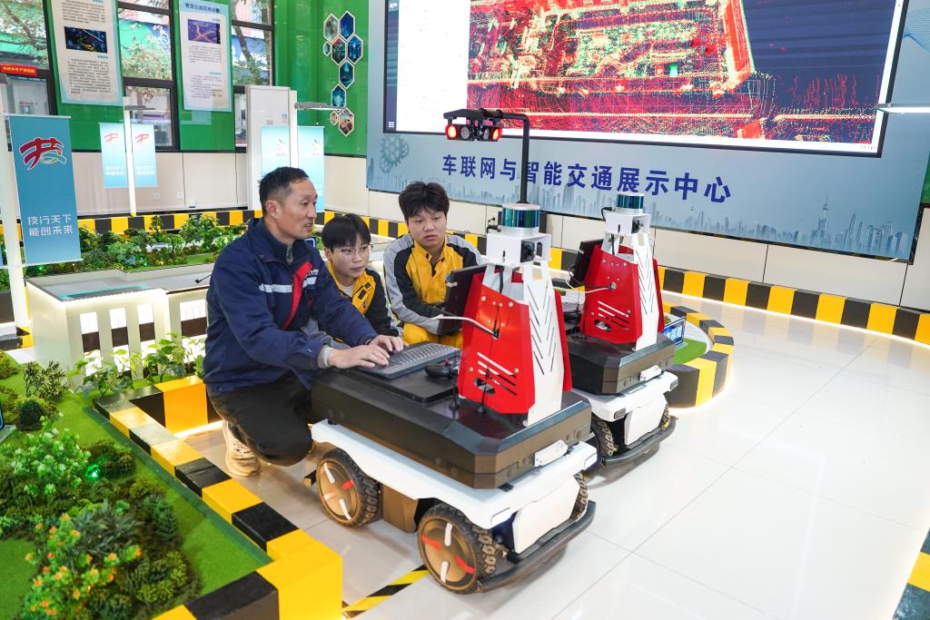 郑飘雪在学校车联网与智能交通展示中心调试自动驾驶车辆。
