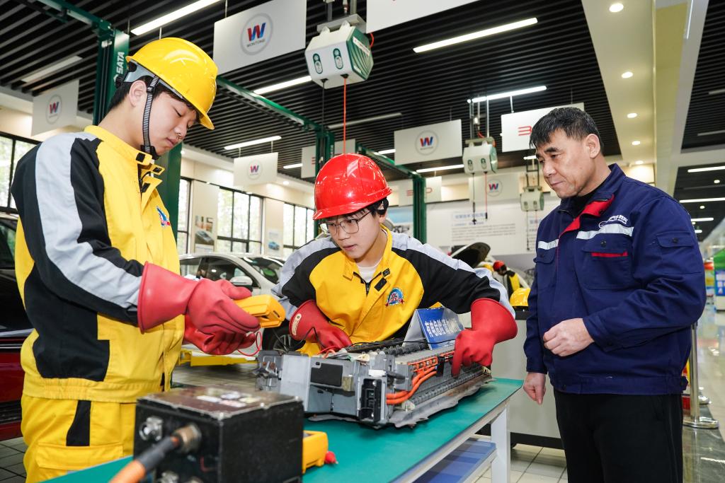郑飘雪(中)、王文韬在老师时海峰的指导下学习检测新能源汽车电池压差。
