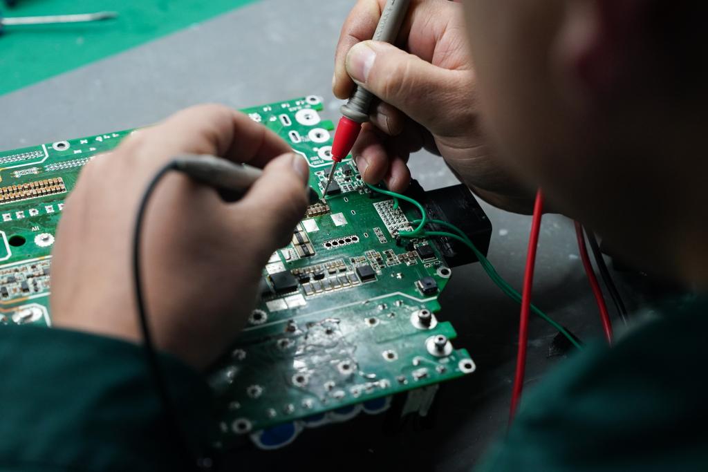 赵飞在公司修理新能源汽车电路板。
