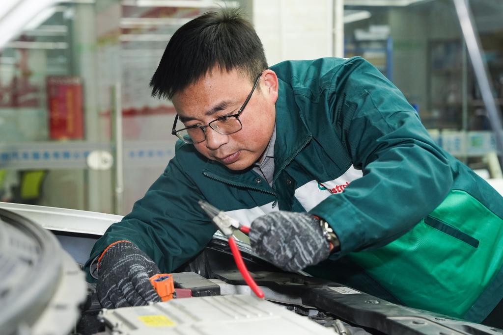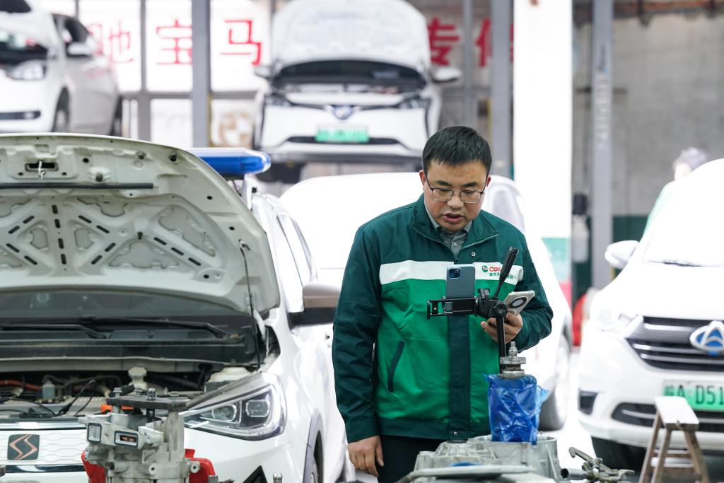 赵飞在修理新能源汽车。