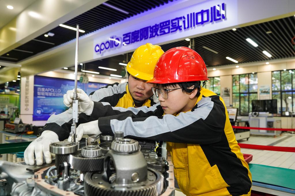 郑飘雪(右)与同学王文韬在学校新能源汽车实训中心内学习。