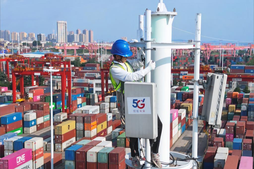 在武汉阳逻港,工人正在安装5G设备。(受访单位提供)