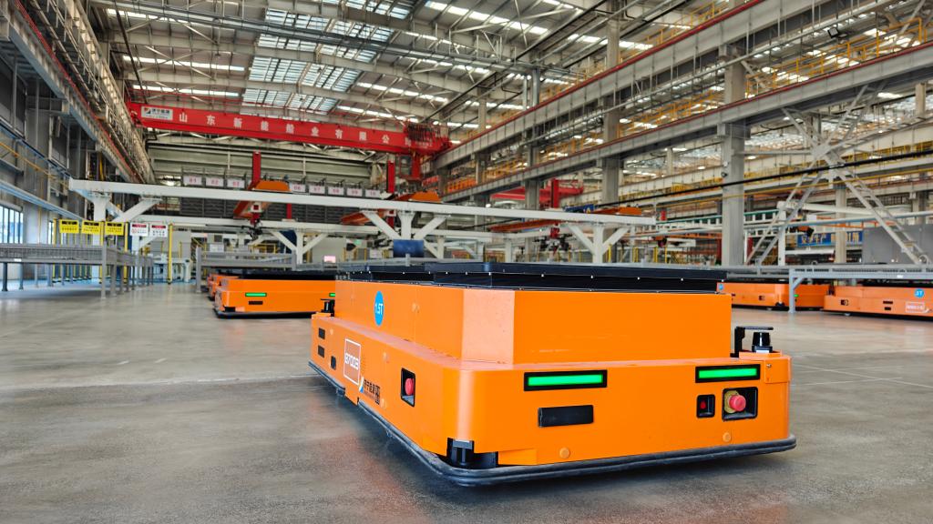 在山东新能船业有限公司的联合车间,自动导向车承担生产物料运输功能。新华社记者萧海川 摄