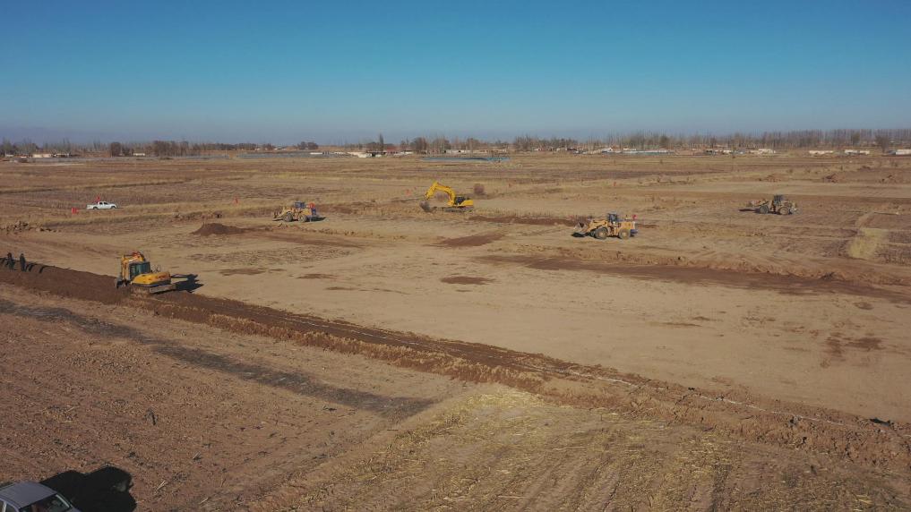 磴口县高标准农田建设项目区里大型机械正在进行土地平整作业。(姚鑫 摄)