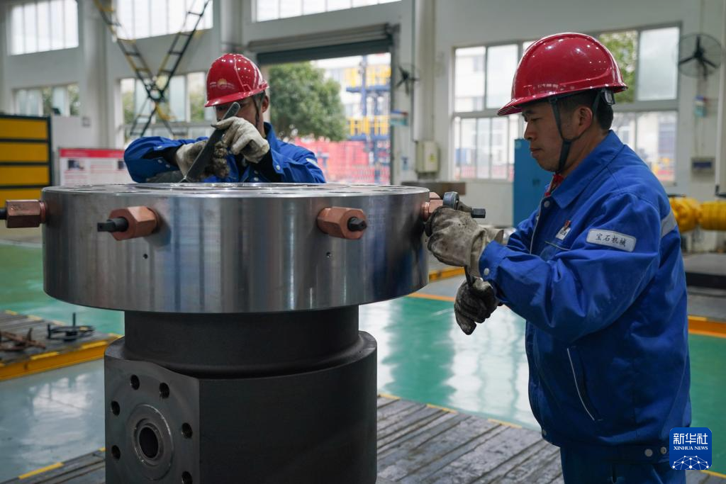 12月21日,在四川宝石机械钻采设备有限责任公司,工人们在调试套管头。新华社记者 胥冰洁 摄