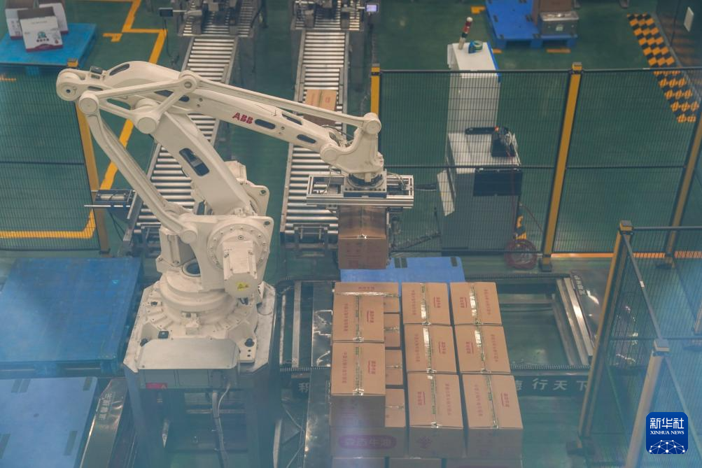 12月21日,在广汉市迈德乐食品有限公司的味控智造车间,机械臂将包装好的牛油从生产线上取出。新华社记者 胥冰洁 摄