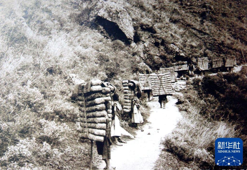 1903年茶马古道上,背夫从四川泸定背茶前往青藏高原。新华社发