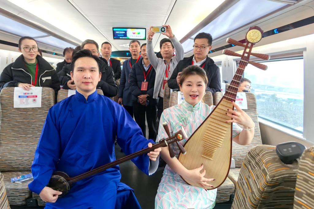 “七里山塘景物新……”首发列车在水乡湖荡间飞驰,琵琶声响、演员亮腔,车厢里江南风韵盎然,乘客们被苏州评弹深深吸引。许多人感慨,高铁上听评弹以前难以想象。但随着基础设施不断提升,文化的载体必然不断增多。文化有魅力,发展就有活力。(记者杨绍功)