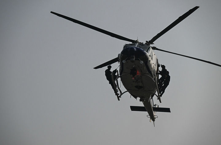 在南京市江北新区七里河特警训练基地,南京市公安局特战队员在“警营开放月”活动现场进行战术演示(2024年12月7日摄)。新华社记者 季春鹏 摄