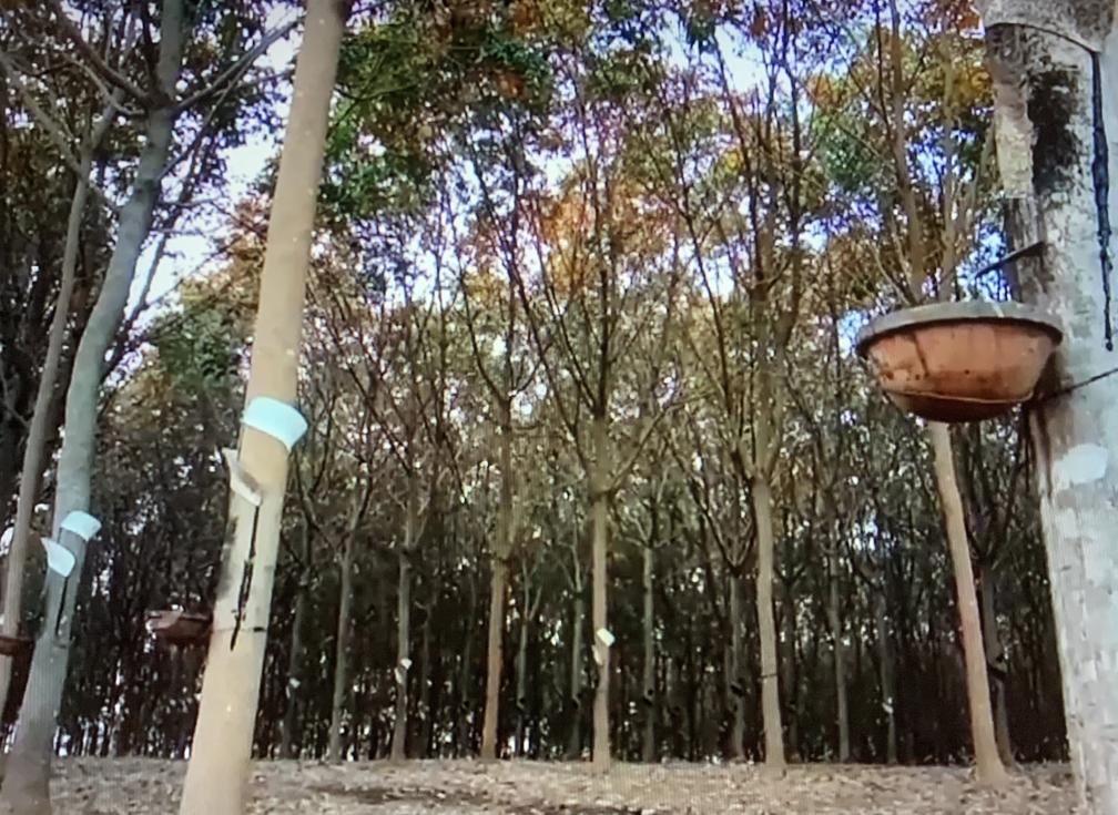 这张视频截图为2023年在柬埔寨特本克蒙省拍摄的橡胶林。橡胶产业今天仍是柬埔寨的重要特色产业之一。万坡摄