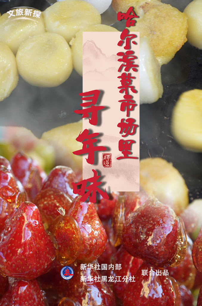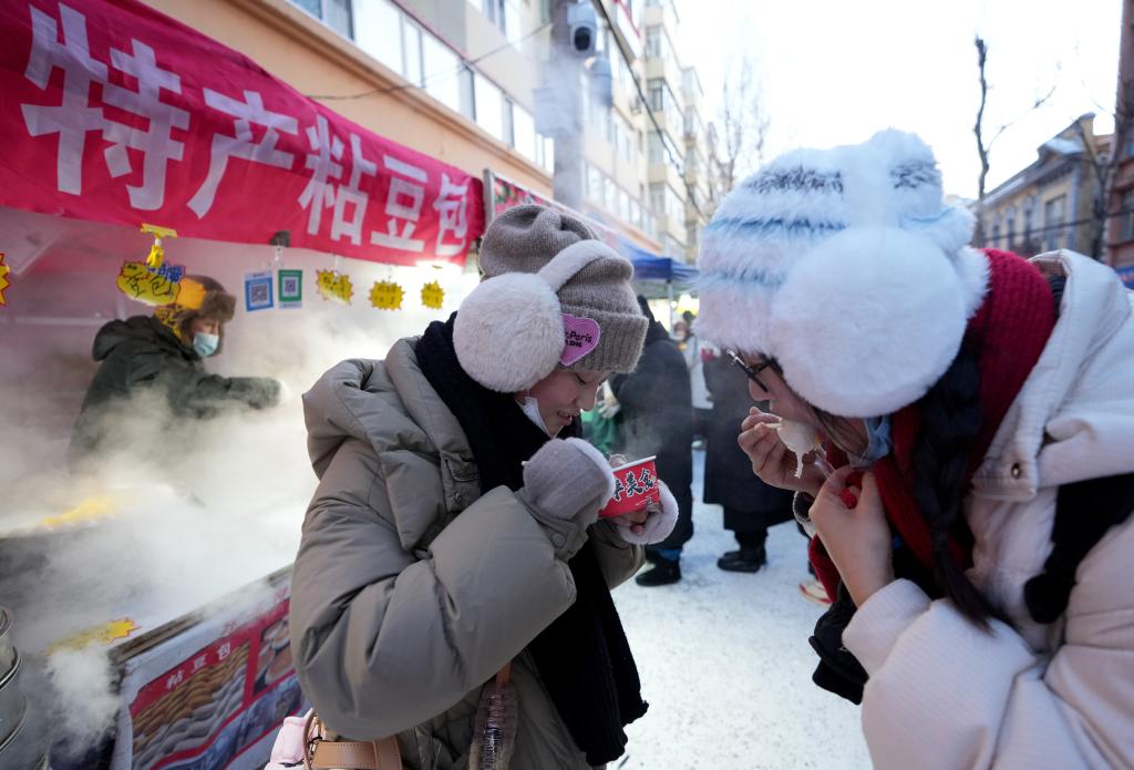 临近春节,小吃、特产、文创产品的摊位琳琅满目,广东游客赵怡然选购了哈尔滨红肠、东宁木耳、冰箱贴作为新年伴手礼,“果然东北的年味更浓。”